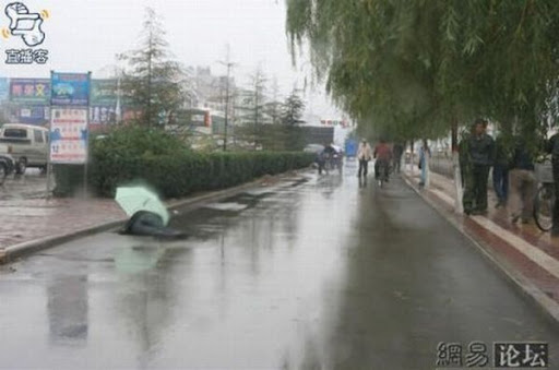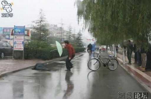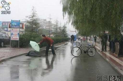 Χμ, φαίνεται ότι αυτός ο ποδηλάτης θα πάει να την βοηθήσει, αφού πρώτα βάλει μία ομπρέλα πάνω της για να την προστατέψει από τη βροχή.